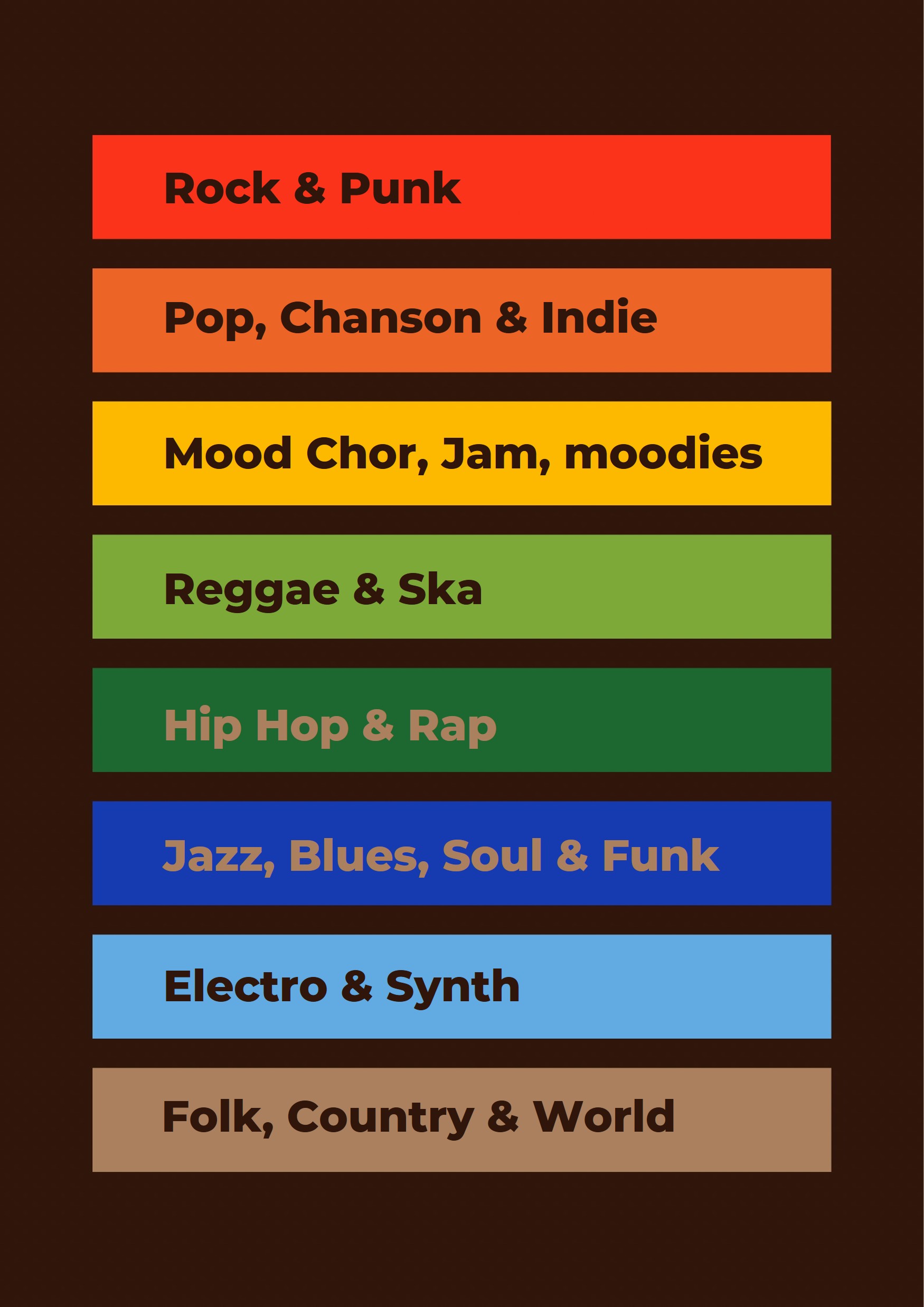 Wir haben jeder Hauptstilrichtung eine Farbe zugewiesen und beginnen diesen Monat die Farben den Veranstaltungen in der Programmvorschau zuzuordnen.