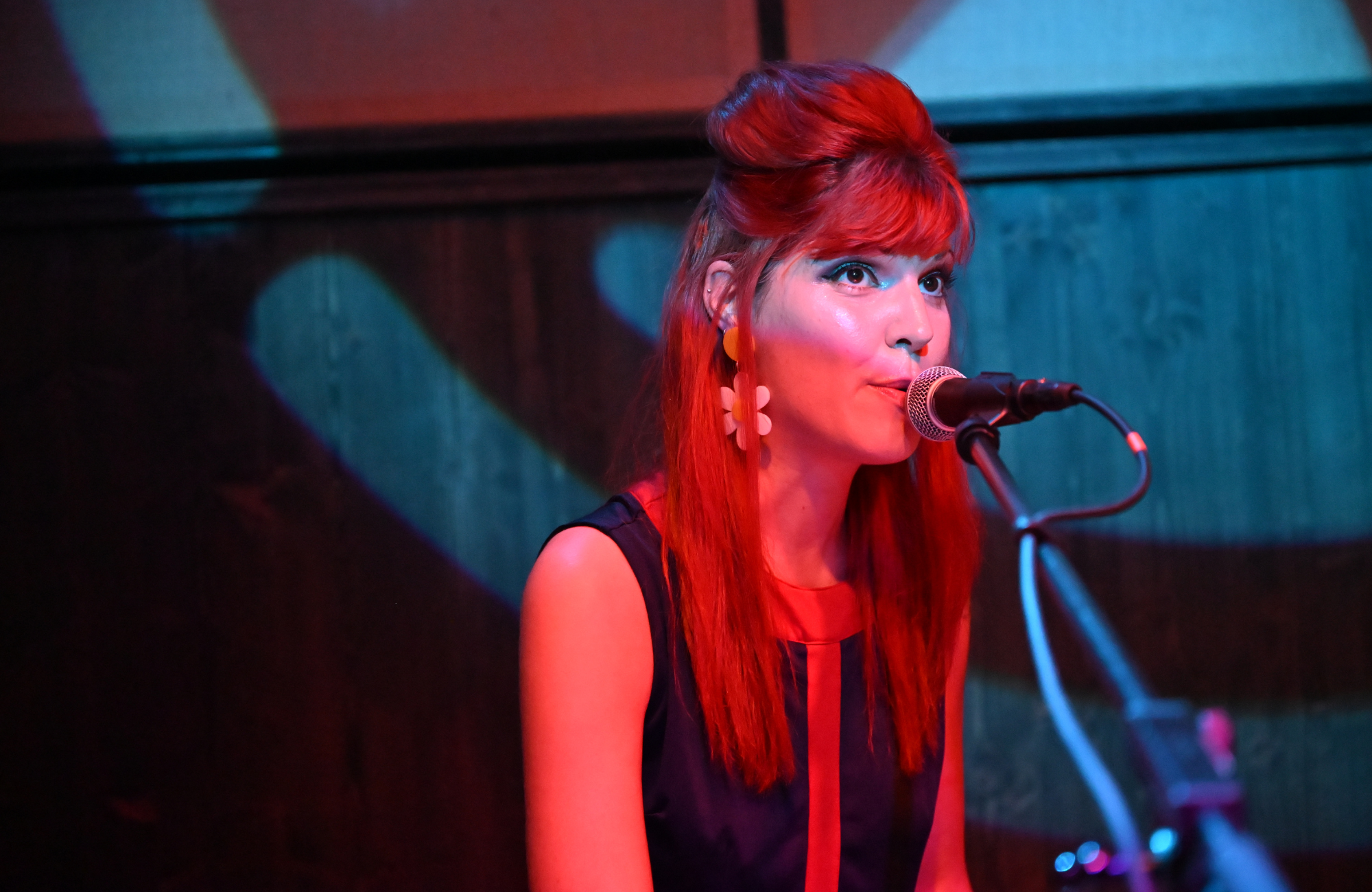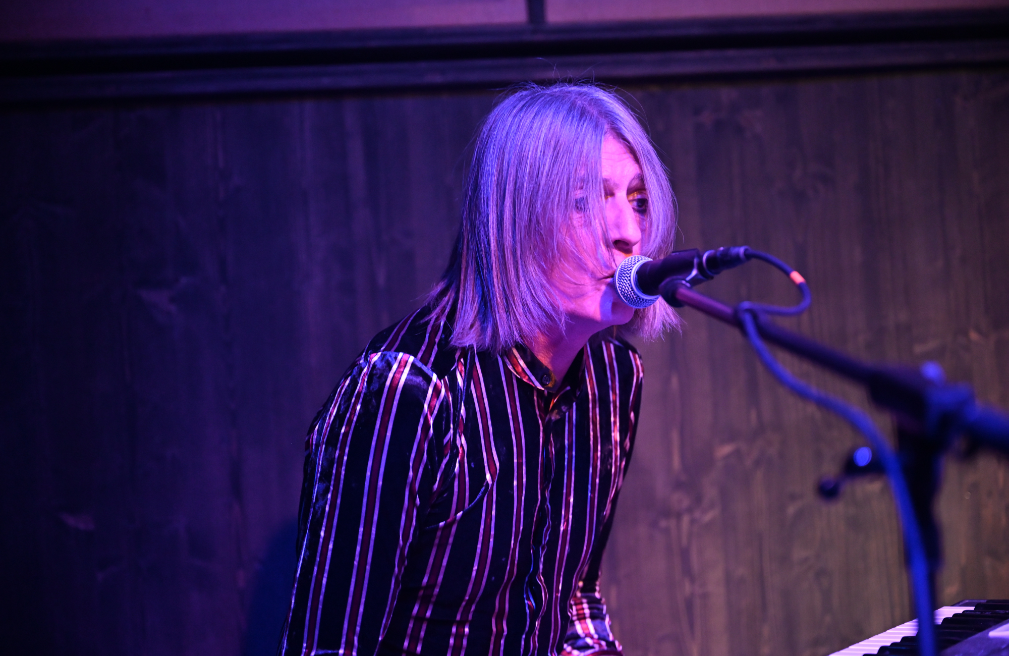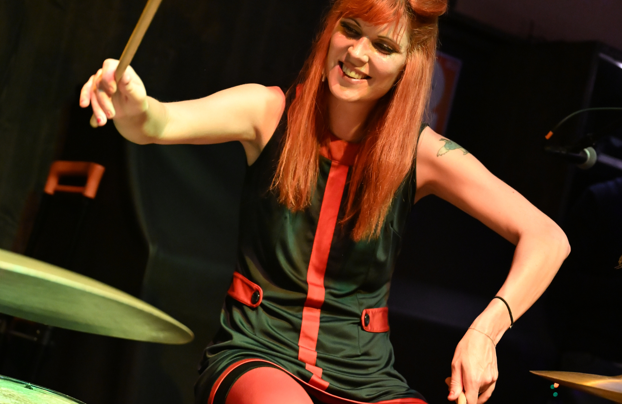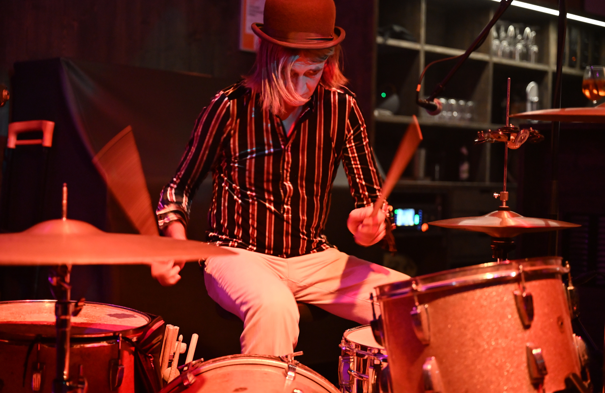 Sie schmettert die Scheiße aus dem Kit, wobei ihre Haare überall hinfliegen, während er, 20 Jahre älter und verzweifelt bemüht, mitzuhalten, auf das Fender Rhodes einhämmert und sich die Seele aus dem Leib schreit, wobei er immer versucht, wie ein knurrender Steve Marriott zu wirken, aber eher wie ein wütender Dean Friedman rüberkommt. Dann tauschen sie, und jetzt bist du total auf dem falschen Fuß, weil er sich jetzt ins Set legt und sie aufsteht... ihre intensiven braunen Augen starren dich an; Melodien aus einer Zeit weit vor ihrer Zeit und eine durchdringende, kreischende Stimme, die immer nur oberhalb des hohen C zu Hause zu sein scheint.